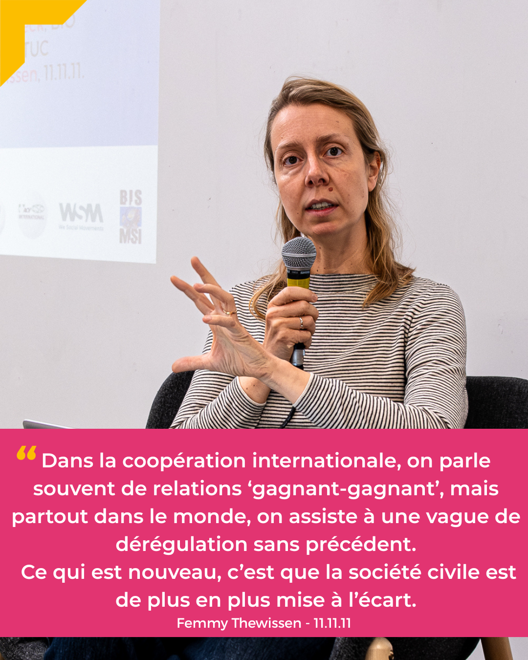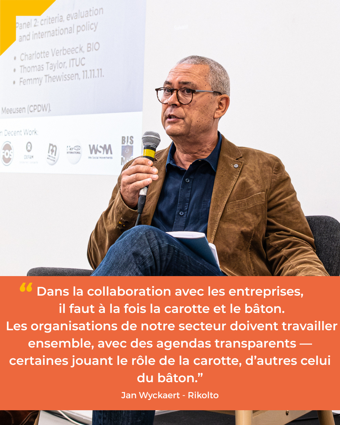 Avec la PCTD, nous avons invité des intervenants de WSM, Rikolto, le Monde selon les Femmes, la Confédération Syndicale Internationale (CSI), 11.11.11. et BIO à dialoguer sur ce sujet. Nous revenons sur un riche échange autour de la manière de collaborer avec des acteurs du secteur privé, allant des organisations de l'économie sociale et solidaire aux petits indépendants en passant par les grandes chaînes de supermarchés. Ce fut une étape importante dans la découverte de nos visions et stratégies respectives. L'une des déclarations qui nous a marqués est celle de Jan Wyckaert, de Rikolto: « Dans la collaboration avec les entreprises, il faut à la fois la carotte et le bâton. Les organisations de notre secteur doivent collaborer, avec des agendas transparents, certains utilisant le bâton et d'autres la carotte. » En tout cas, le séminaire nous a donné envie et nous a fourni la matière nécessaire pour poursuivre le dialogue à ce sujet.