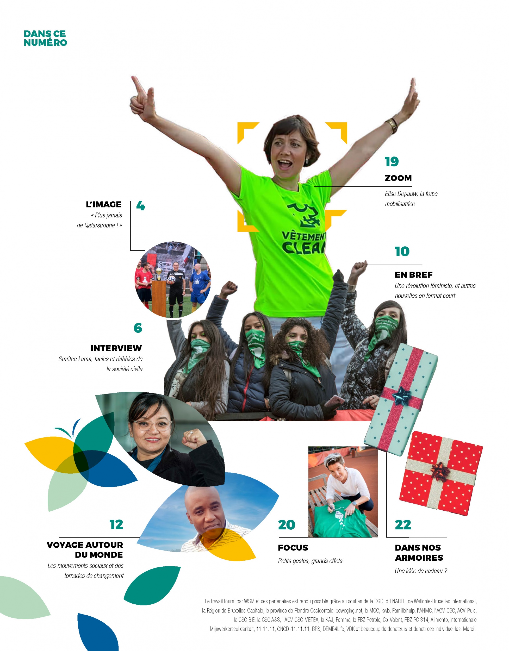 Le changement social ne s’opère que par des actions soutenues dans le temps, et reliées entre elle dans une lutte commune. Dans une vision partagée de ce à quoi le monde devrait ressembler. Des cadeaux équitables sous le sapin de Noël, des repas végétariens, le vélo et les transports en commun... Cela reste des choix qui comptent. Mais s’ils restent au niveau des actions individuelles, nous n’atteindrons jamais le coeur du problème : celui ou celle qui est responsable doit assumer ses responsabilités. En d’autres termes : les responsables politiques et le monde des affaires doivent également traiter les personnes et la planète différemment. Et ce, à tous les niveaux. C’est précisément ce que visent les mouvements sociaux. Ils exposent ce qui ne va pas. Ils indiquent une direction. Ils mettent en place des alternatives pour montrer comment les choses peuvent être faites différemment. Ils relient les actions individuelles de nombreuses personnes à une lutte collective, mettant ainsi en marche le changement social. Lisez ce qu’en disent Smritee Lama du Népal, Anatole Mangala de la RD Congo, Judith Agilar Guirón au Guatemala, mais aussi Elise Depauw en Belgique. Un petit geste peut faire la différence lorsqu’il s’inscrit dans une perspective plus large. Soutenir activement les mouvements sociaux dans ce qu’ils font en est un. En tant que donateur ou donatrice de WSM, vous contribuez vous aussi à initier le changement. Merci ! Nous vous souhaitons le meilleur pour 2023.