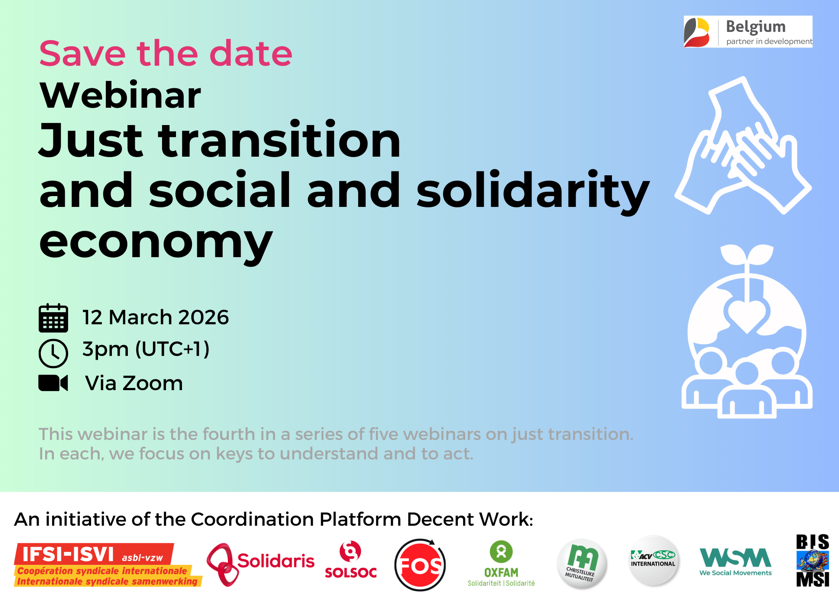 Welkom op 12 maart op het webinar over sociaal rechtvaardige transitie en sociale en solidaire economie, georganiseerd door het Coördinatieplatform Waardig Werk. Meevolgen kan in Engels, Frans en Spaans.
