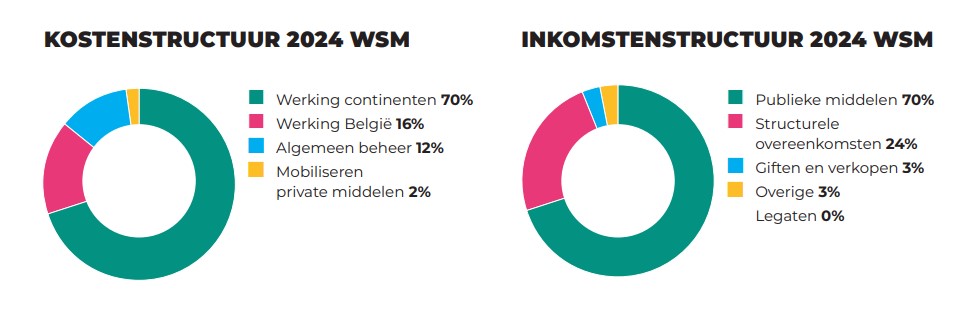 Om in aanmerking te komen voor overheidsfinanciering moet WSM een percentage eigen middelen mobiliseren en inzetten bij de uitvoering van haar meerjarenprogramma’s. Een deel van de actieplannen die de partnerorganisaties uitvoeren, wordt gefinancierd met middelen die bij donateurs opgehaald worden, de zogenaamde eigen middelen van WSM. In 2024 maken deze 30% van de totale inkomsten uit.